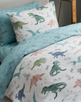 Children's sheet set with dinosaur illustrations, in soft colors.